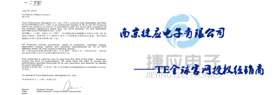 南京捷應(yīng)電子有限公司是國際無源器件品牌美國泰科電子(TE)在中國華東地區(qū)的主要通路商,代理經(jīng)銷旗下全系列產(chǎn)品包括TYCO(AMP)系列連接器、接插件、OEG、SCHRACK、P&B功率繼電器、美國RACHEM各類航空導(dǎo)線、熱縮套管、?s套、標(biāo)識(shí)產(chǎn)品、電線電纜。